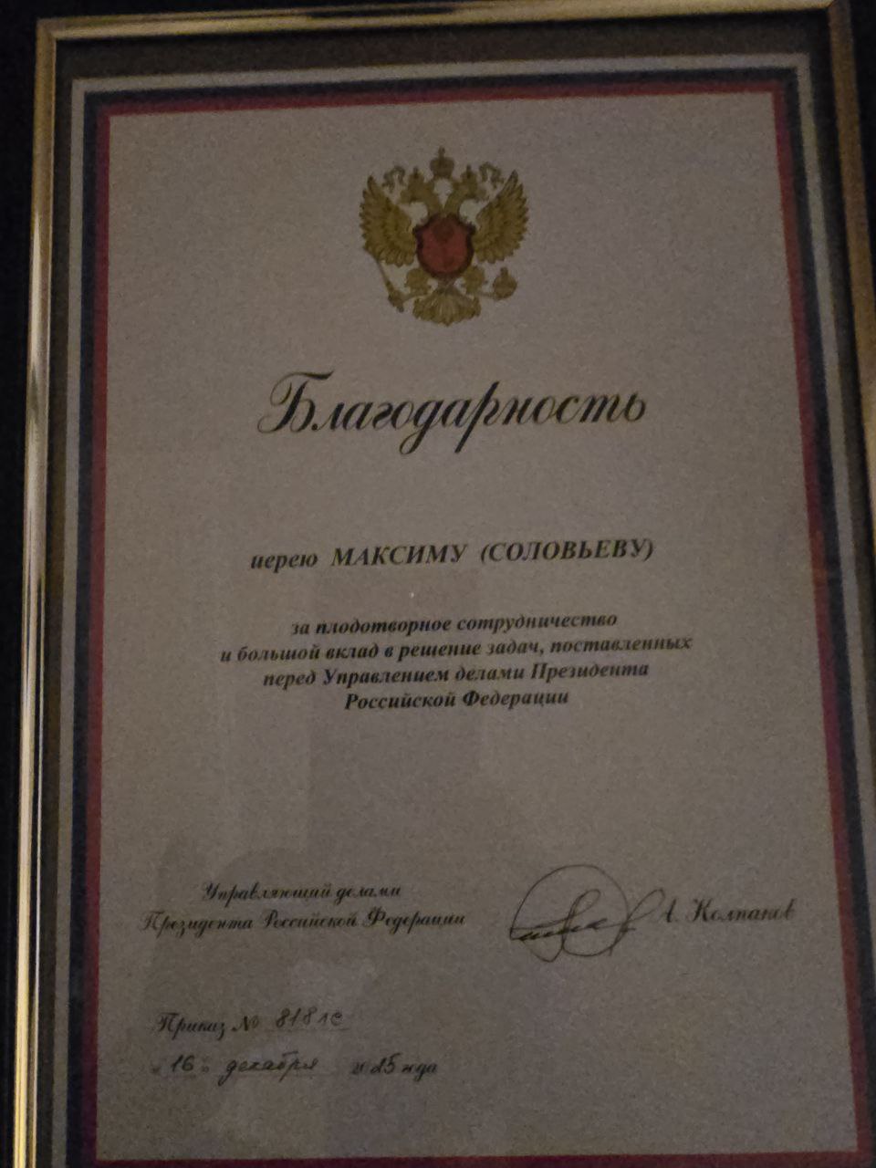29 января, по приглашению руководителя аппарата Управления делами Президента РФ, настоятель храма Вознесения Господня в Сатино-Русском, священник Максим Соловьев, принял участие в торжественном акте. От лица Управления делами Президента, руководитель ФГБУ Хорошайло Александр Викторович вручил отцу Максиму благодарность за гуманитарную работу в зоне СВО.